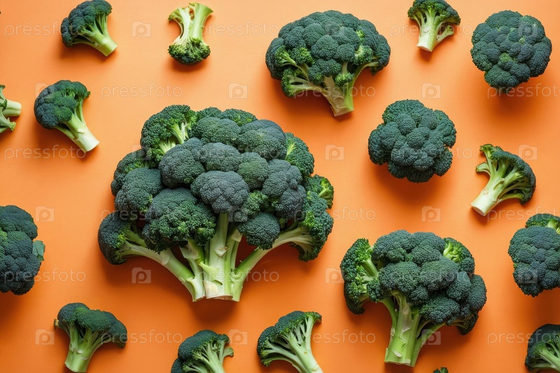 Flat lay pattern of ripe broccoli vegetable, top view summer organic fresh background AI Generative Плоский укладный рисунок спелого овоща брокколи, верхний вид летнего органического свежего фона ИИ генеративная