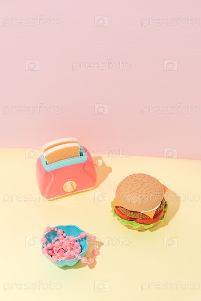 Творческое абстрактное искусство бургер, тост и тарелка с бусинами натюрморт плоский лежит на пастельно-желтом и розовом фоне минимализма