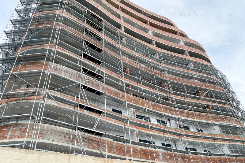 Здание, находящееся в стадии строительства с лесами, многоэтажное каркасное здание