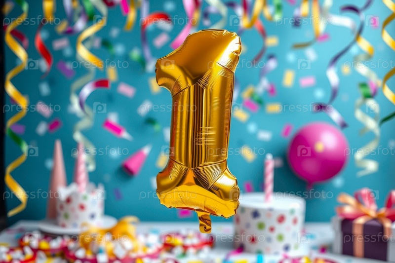 Гелиевый баллон рождения формы номер один, фигура золотой буквы 1 на праздновании праздничный фон