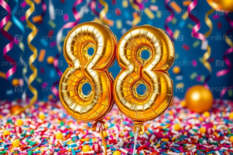 Гелиевый баллон на день рождения номер восемьдесят восьмой, фигура золотой буквы 88 праздник праздничный фон