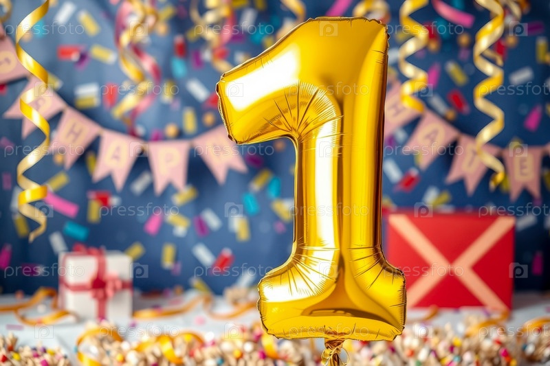 Гелиевый баллон рождения формы номер один, фигура золотой буквы 1 на праздновании праздничный фон