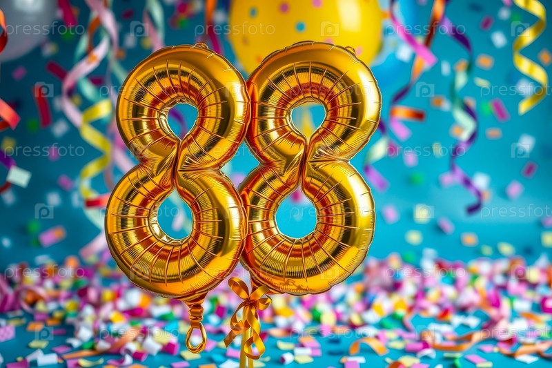 Гелиевый баллон на день рождения номер восемьдесят восьмой, фигура золотой буквы 88 праздник праздничный фон