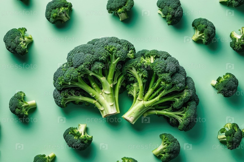 Flat lay pattern of ripe broccoli vegetable, top view summer organic fresh background AI Generative Плоский укладный рисунок спелого овоща брокколи, верхний вид летнего органического свежего фона ИИ генеративная