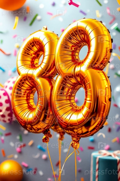 Гелиевый баллон на день рождения номер восемьдесят восьмой, фигура золотой буквы 88 праздник праздничный фон