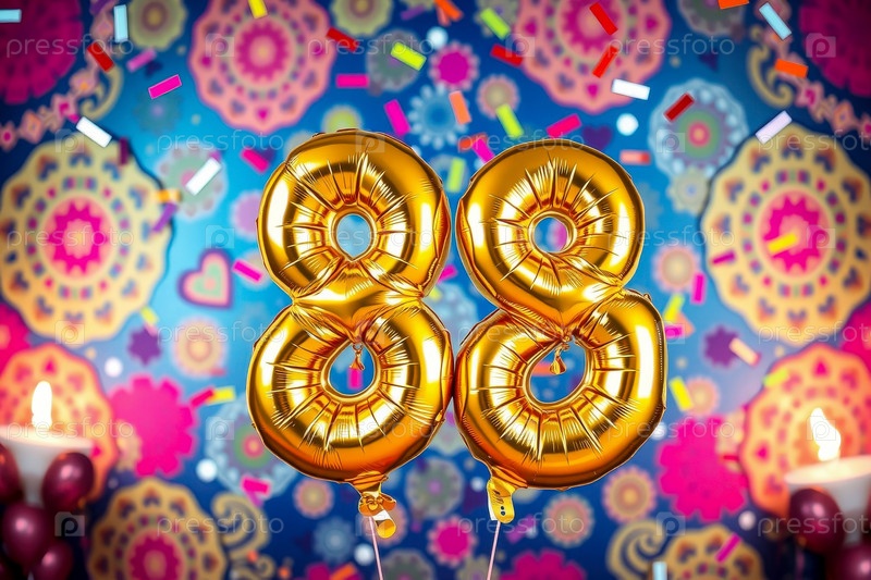 Гелиевый баллон на день рождения номер восемьдесят восьмой, фигура золотой буквы 88 праздник праздничный фон