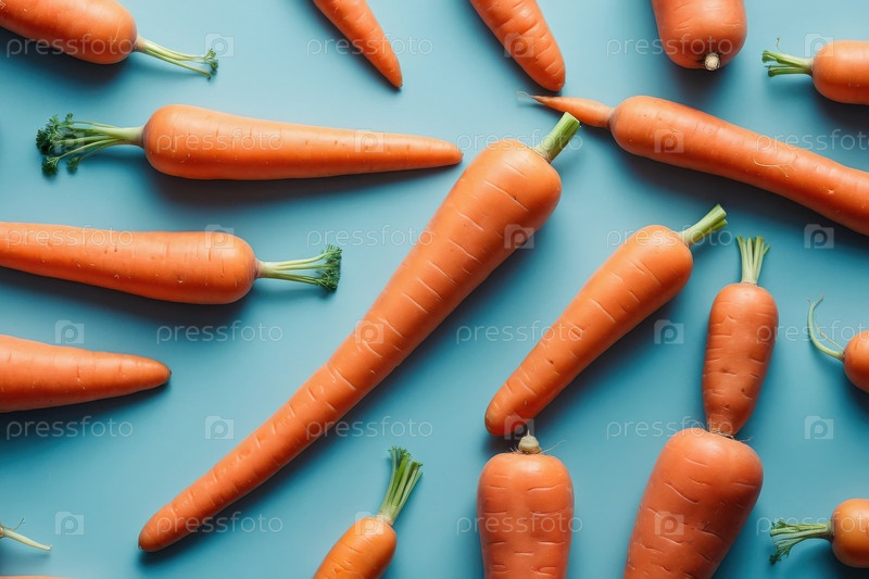AI Generative Flat lay pattern of ripe carrot vegetable, top view on summer organic fresh background (Генеративный образец плоского слоя спелых морковных овощей, верхний вид на летнем органическом свежем фоне)
