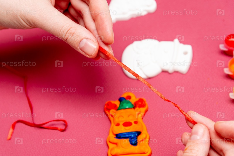 Женщина рисует гипсовые фигуры снеговика, оленя и рождественской елки с цветными красками гуаши, новогодние ручные игрушки декор