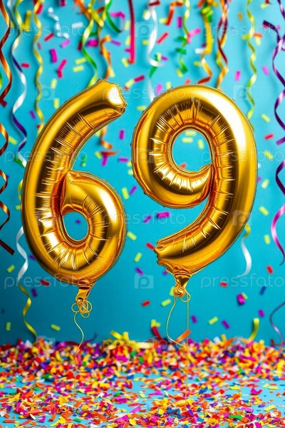Гелий день рождения воздушный шар номер шестьдесят девять, золотые буквы фигура 69 праздник праздничный фон
