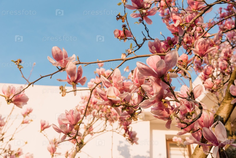 Цветение цветущего дерева Magnolia Soulangeana, розовые почки в саду под лучами заката солнца