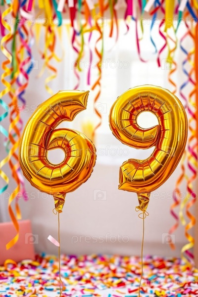 Гелий день рождения воздушный шар номер шестьдесят девять, золотые буквы фигура 69 праздник праздничный фон