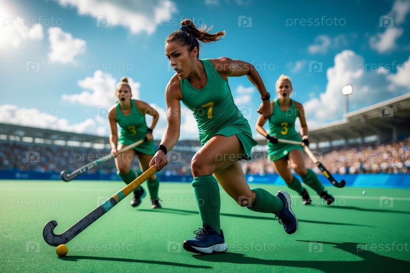 Женская команда по хоккею на поле играет в стадионе, летние Олимпийские игры соревнования AI Generative