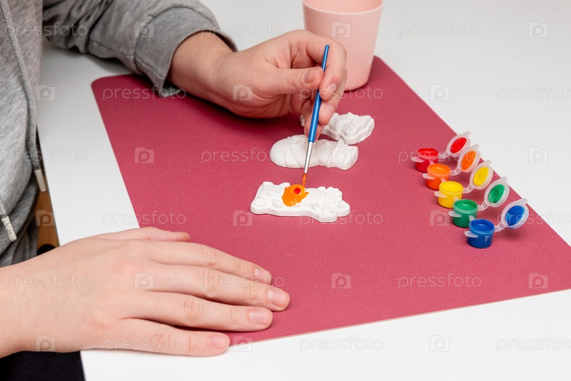 Женщина рисует гипсовые фигуры снеговика, оленя и рождественской елки с цветными красками гуаши, новогодние ручные игрушки декор
