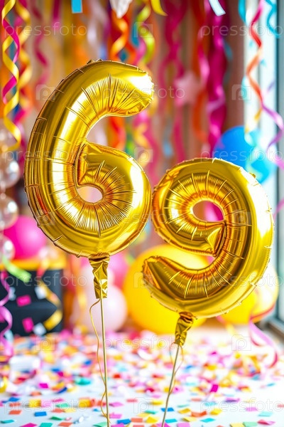 Гелий день рождения воздушный шар номер шестьдесят девять, золотые буквы фигура 69 праздник праздничный фон