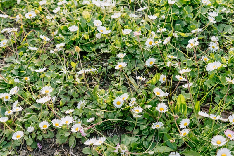 Лиственничная ромашка луга под солнечным светом, цветы распускаются в цветении весной летом