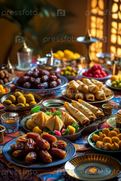 Generative AI Традиционный семейный обед еда ифтар сухор для мусульманского исламского праздника Рамадан