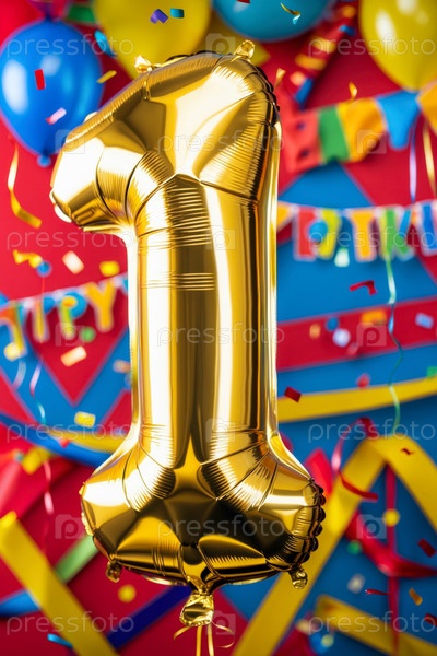 Гелиевый баллон рождения формы номер один, фигура золотой буквы 1 на праздновании праздничный фон