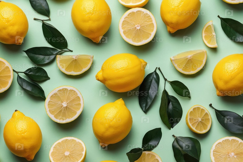 AI Generative Flat lay pattern of ripe lemon fruits, top view on summer organic fresh background (Генеративный образец плоского слоя спелых фруктов лимона, верхний вид на летнем органическом свежем фоне)