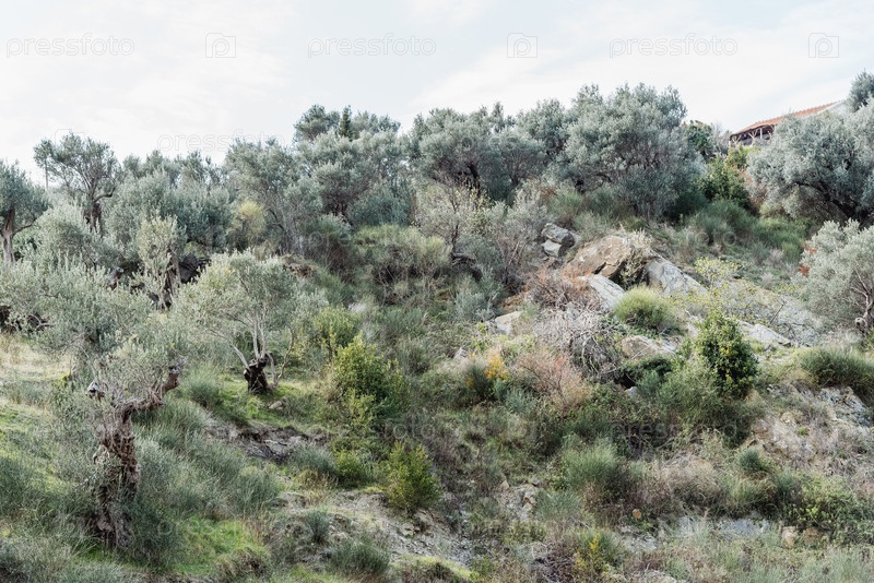 Старые дикие оливковые деревья растут на склоне горы, средиземноморские лесные плантации