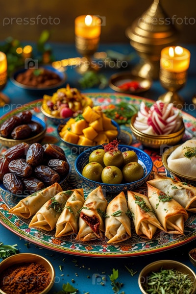 Традиционная семейная трапеза еда ифтар сухор для мусульманского исламского праздника Рамадан AI Generative
