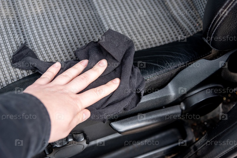 Близкий снимок ручного рабочего механика полировки очистки черного кожаного автомобильного интерьера с тряпкой и профессиональным лак-воском