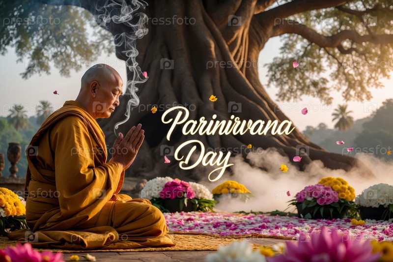 Генеративная открытка Поздравления с буддийским праздником День Паринирвани в честь Будды, достигшего полной нирваны AI