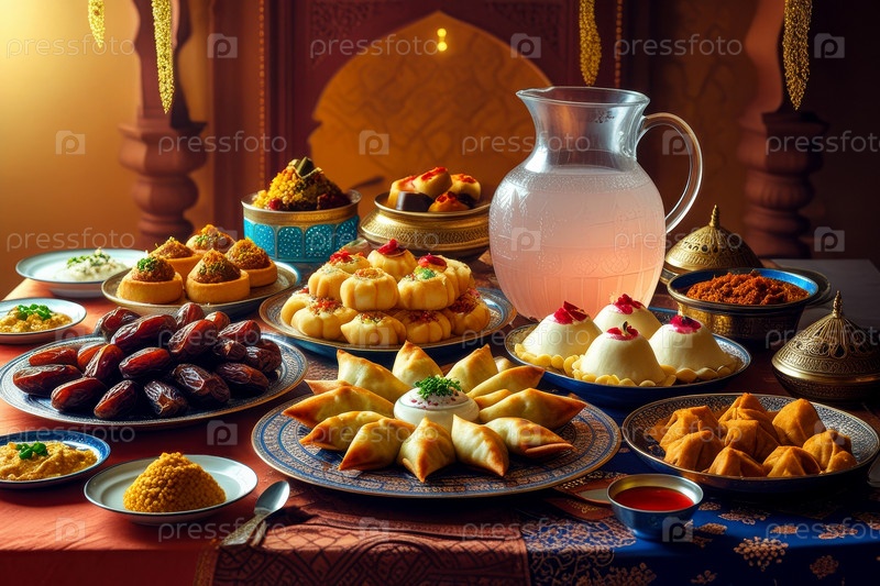 Традиционная семейная трапеза еда ифтар сухор для мусульманского исламского праздника Рамадан AI Generative