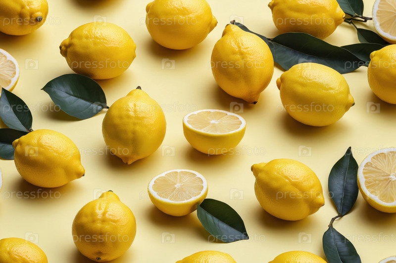 AI Generative Flat lay pattern of ripe lemon fruits, top view on summer organic fresh background (Генеративный образец плоского слоя спелых фруктов лимона, верхний вид на летнем органическом свежем фоне)