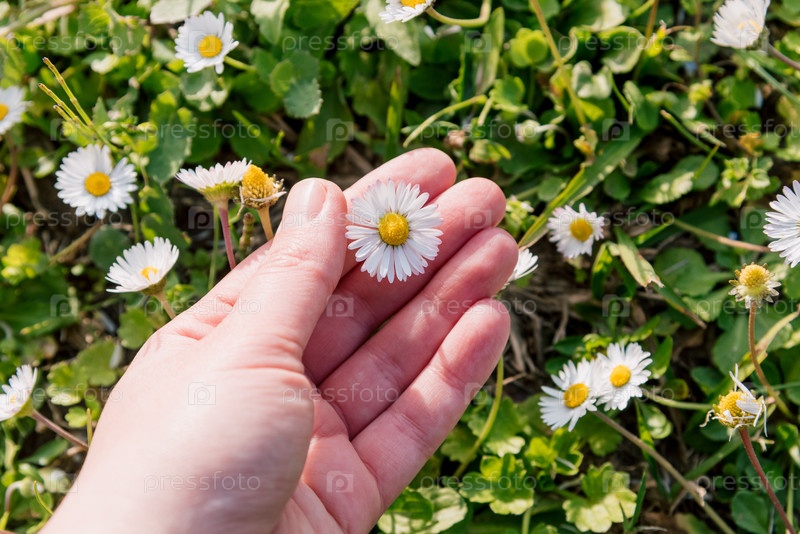 Женщина держит в руках ромашковую маргаритку, цветы распускаются весной и летом
