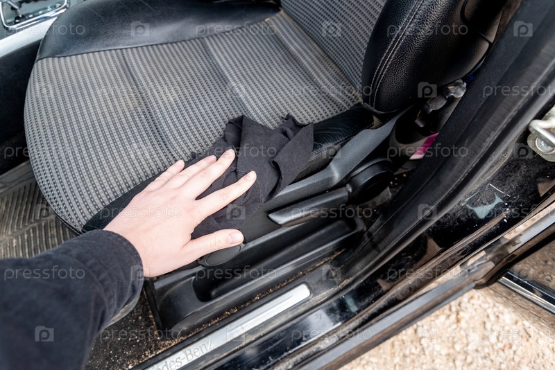 Близкий снимок ручного рабочего механика полировки очистки черного кожаного автомобильного интерьера с тряпкой и профессиональным лак-воском