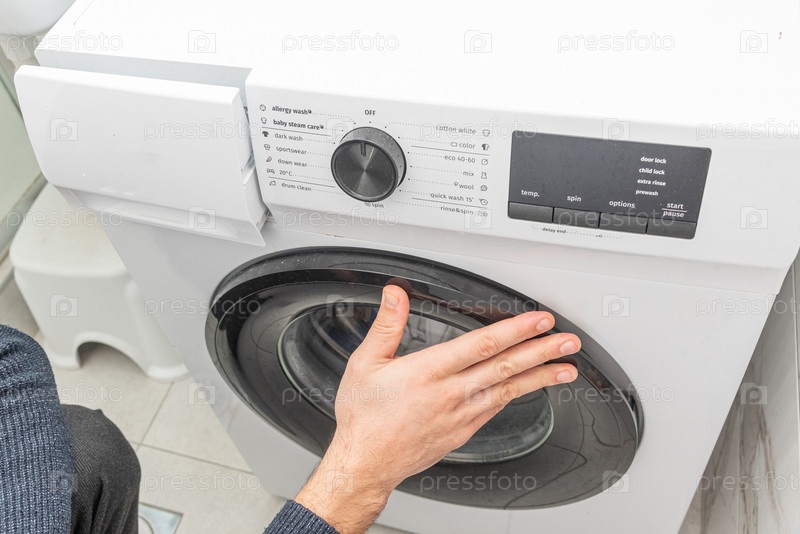 Мужчина кладет грязную одежду в барабан стиральной машины, образ жизни домашние дела