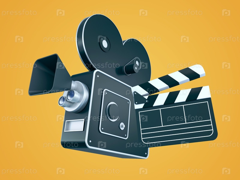 Ретро-кинокамера и кинофлапушка на желтом фоне. 3D-рендеринг