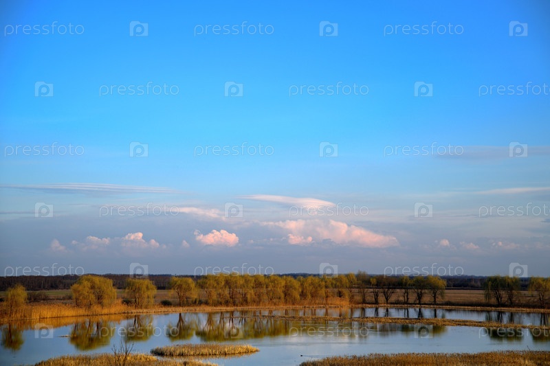 Ивы на озере. Отражение в воде. Голубое небо с розовыми облаками