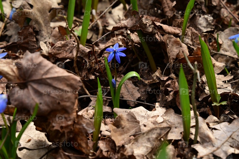 Подснежник с бутоном, сухая листва, свежая зелень