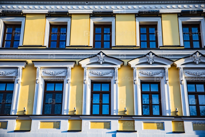 Фасад исторического здания с декоративными окнами и лепниной, Москва, улица Арбат 43