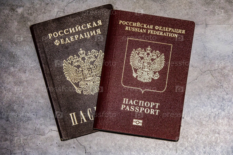 Два российских паспорта на сером каменном фоне, документы