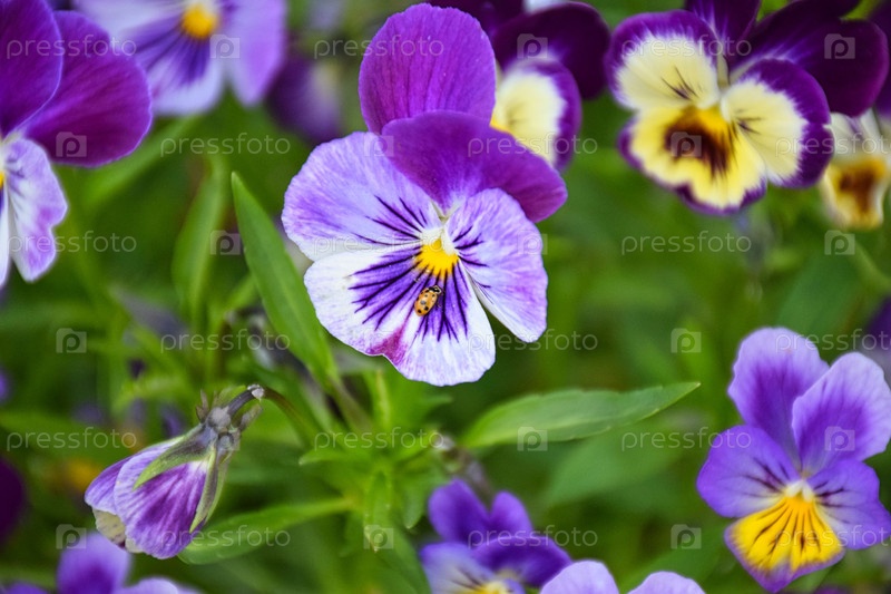 Фиалка трехцветная, или анютины глазки цветет на клумбе в летнем саду