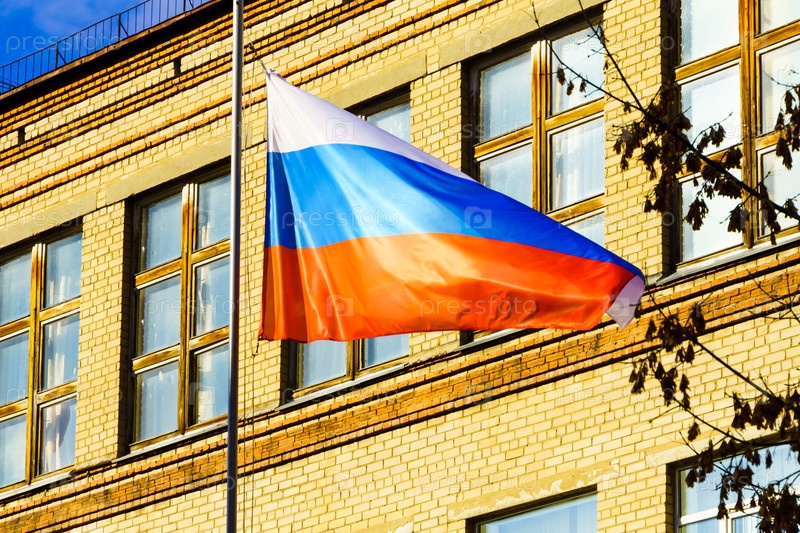 Городской пейзаж. Флаг России на территории школы №48. Воронеж