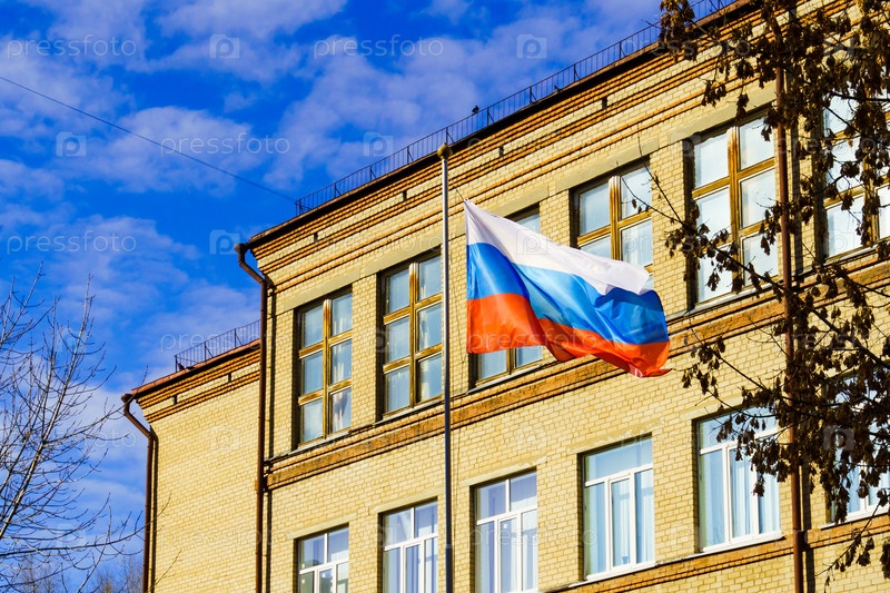 Городской пейзаж. Флаг России на территории школы №48. Воронеж