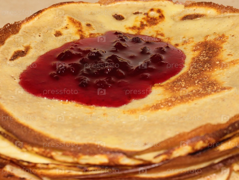Красивый малиновый варенье течет над кучей красных блинов