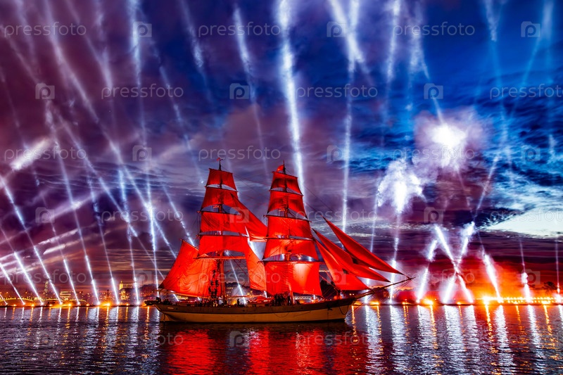 Парусник с красными парусами на празднике Алые паруса в Санкт-Петербурге