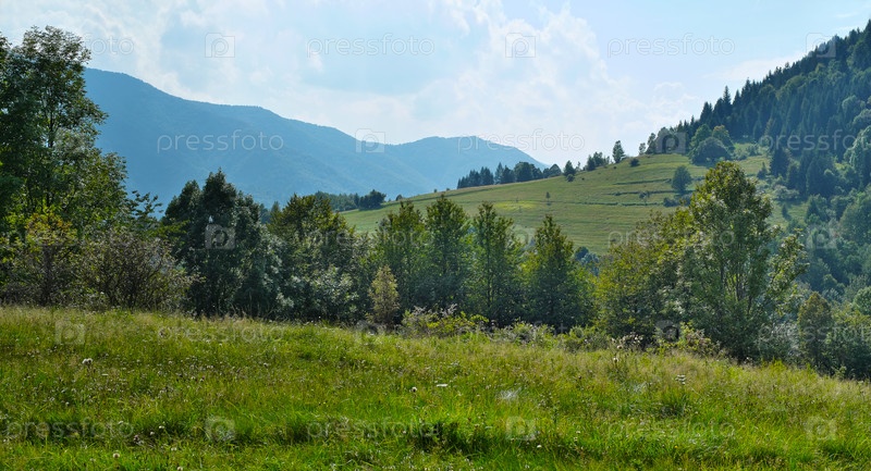 Летний вид на долину с зелеными полями и лесистыми горами в Центральной Европе