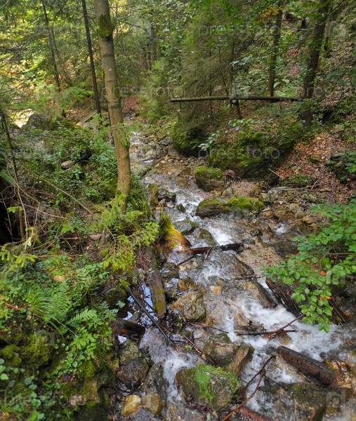 Горный ручей, протекающий через густые летние леса в Центральной Европе, вид сверху вниз