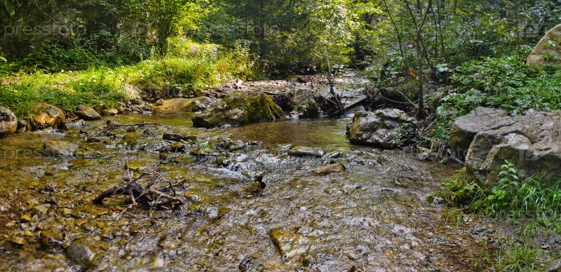 Горный ручей, протекающий через густые летние леса в Центральной Европе, вид сверху вниз