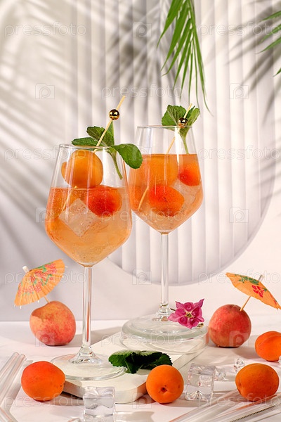 Королевский лимонадный коктейль с персиком, абрикосом, мохито с текилой, джином, ромом, водкой, ликером, лаймом, льдом и свежей мятой, концепцией бара и вечеринки, рекламной карточкой ресторана и кафе, летним алкоголем