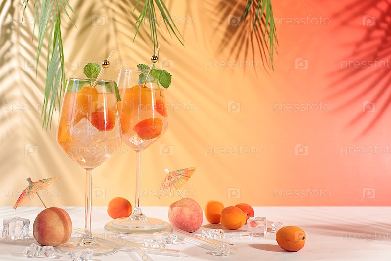 Современный натюрморт с фруктами. коктейль королевского лимонада с персиком, абрикосом, мохито с текилой, джин, ром, лед и свежая мята, концепция бара и вечеринки, рекламная карточка ресторана и кафе