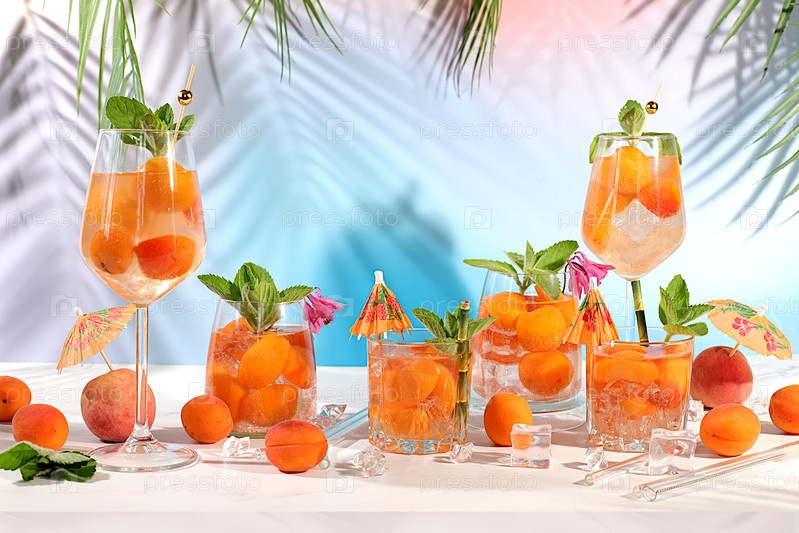 Современный натюрморт с мохито, алкогольным коктейлем, персиком, абрикосом и мятными ягодами на элегантном современном фоне, минималистическая концепция для бара и праздничной вечеринки, кафе, рекламный баннер,