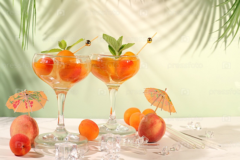 Алкогольный коктейль или пунш, персик, абрикос и мятные ягоды на элегантном фоне, минималистическая концепция для бара и праздничной вечеринки, кафе, рекламный баннер, современная натюрморт с фруктами