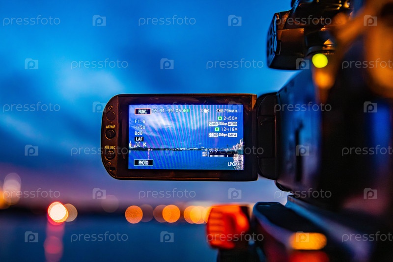 Видеокамера с экраном, снимающая ночной городской пейзаж у воды