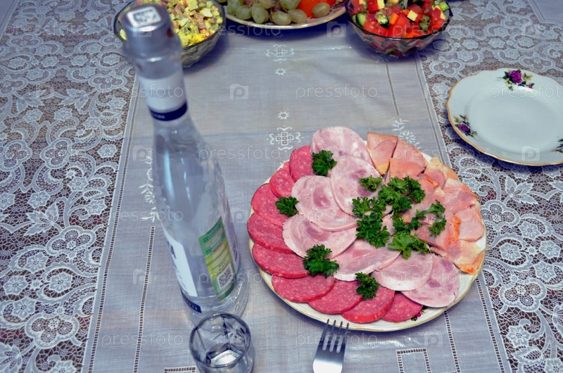Бутылка с водкой, рюмка и нарезанная колбаса в тарелке